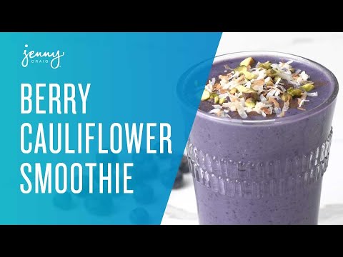 [text on screen]: Simply Inspired Blueberry Cauliflower Smoothie. Ingredients: Jenny Craig Vanilla Cream Shake, 1 TBSP Almond Butter, 1 1/2 Cups Frozen Organic Cauliflower, 3/4 Frozen Organic Blueberries, 3/4 cup water, 2 TBSP Frozen Avocado, 1/2 TSP Organic Cinnamon. Makes 2 servings. Per serving: 2 fat, 1 1/2 vegetable, 1/2 milk, 1/2 fruit (Classic Menu Only). Load Up The Blender (Solids, Then Liquids), Blend Until Smooth and Thick, Warning: May Mesmerize, Top With Cinnamon, 1 TBSP Coconut Flakes, 1 TBSP Crushed Pistachios.