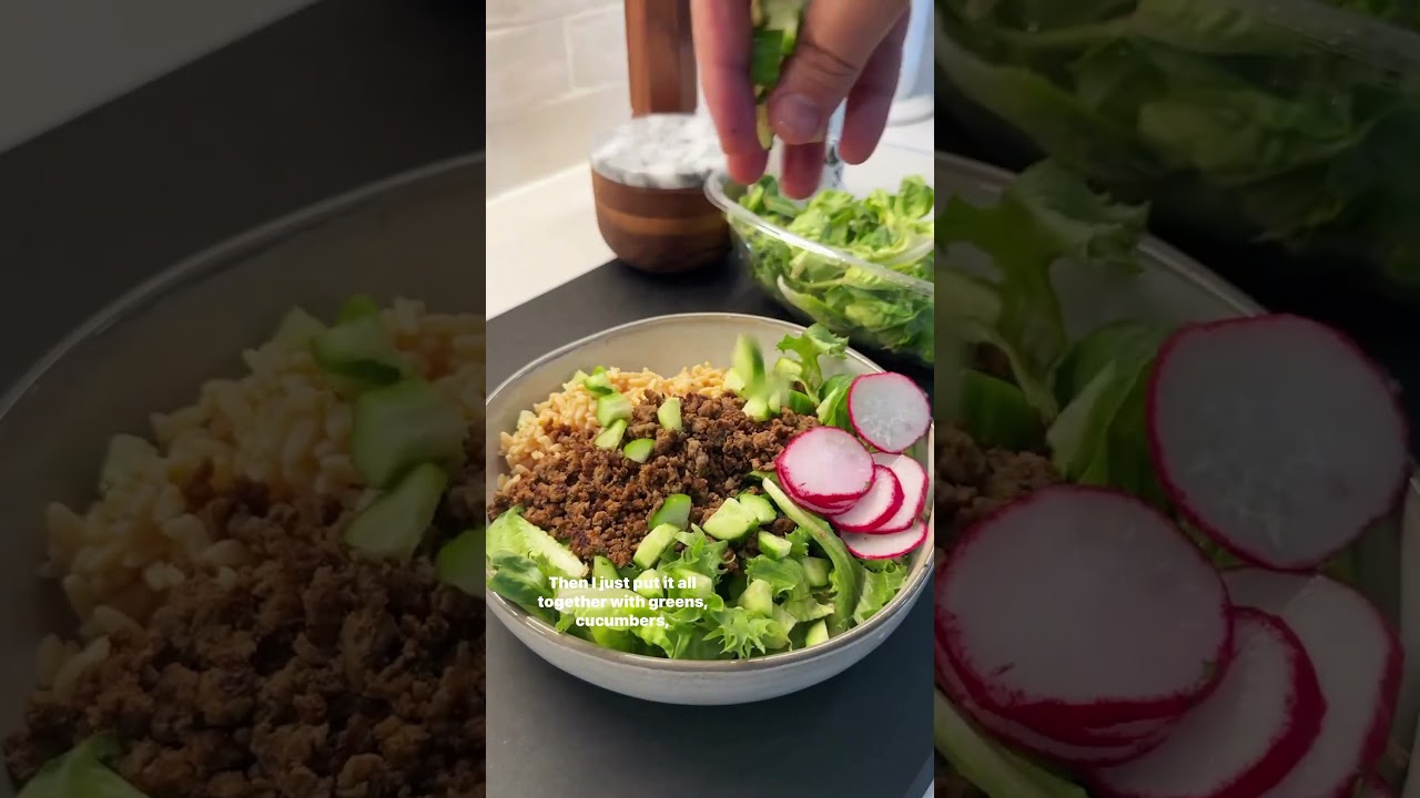 6.Then assemble and enjoy! I used a large base of greens and my Kaizen protein rice, added the minced cooked beef, added the avocado, cucumbers, radish, toasted pine nuts, and added some of the yogurt sauce.