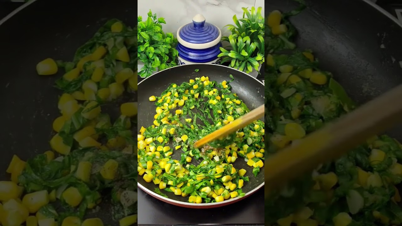 4. Add chopped garlic, chopped spinach leaves & the boiled 🌽corn. Stir for 2 mins.