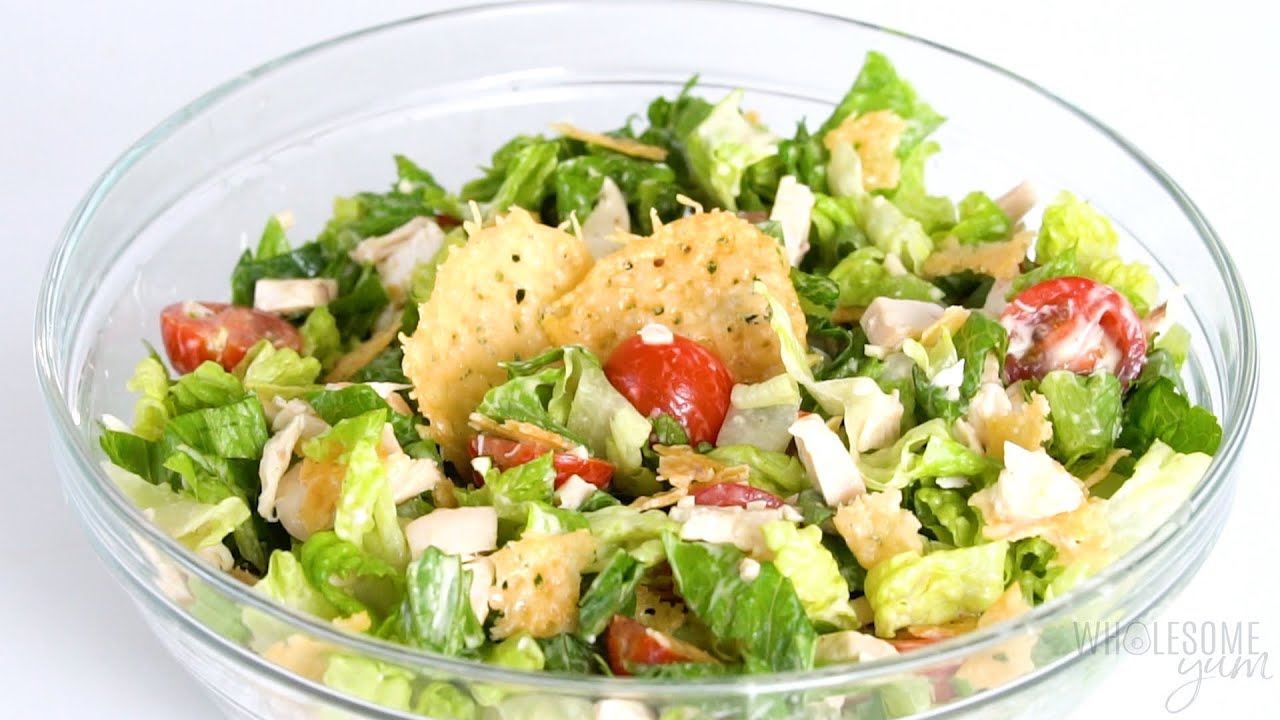 Caesar salad on keto is simple to make, with common ingredients! This easy keto Caesar salad recipe with chicken features parm crisps and homemade keto Caesar dressing.