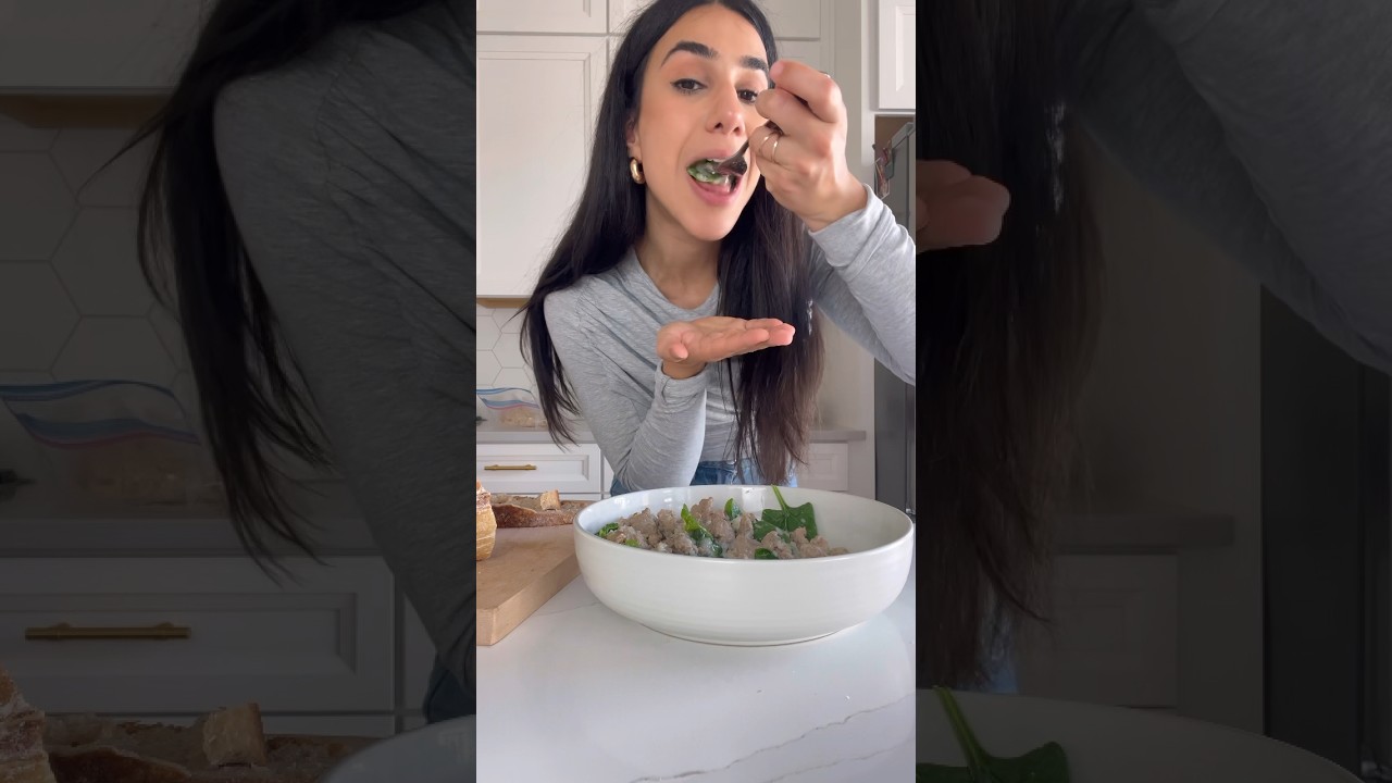 let’s make a weight loss friendly dinner with just a few ingredients in like 10 minutes grean ground turkey 2 lb salt pepper onion powder and garlic powder you don’t have to measure just eyeball it break it up brown it over the stove just Brown and a little bit of pink is okay cuz it’s going to continue to cook with 8 oz of mushrooms and 12 oz of frozen cauliflower rice once the veggies are wilted or soft alfredo sauce of choice this one has about 45 calories per serving so if we use the whole entire jar and this makes four servings then we’ll come out to about 400 calories of serving of this 40 g of protein it’s fluffed with veggies and then you can serve it with like a slice of bread or something for another 100 calories so now you have 500 calories serving and a true carb Source I’m going to take spinach to just cuz I like adding color wow I’ll never get over my sour though I’m not going to lie great with bread absolutely fantastic with a fork okay bye enjoy