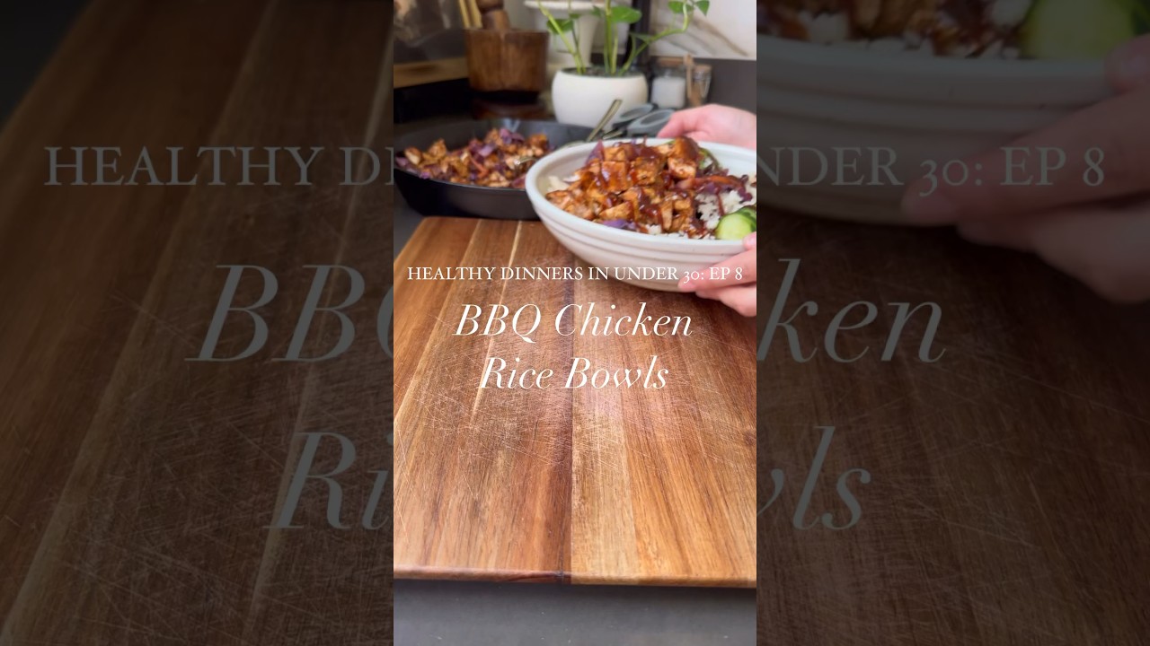 barbecue chicken rice bowls that are made with Crispy caramelized barbecue chicken over rice and veggies these are so good welcome to episode 8 of healthy dinners and under 30 if you’ve been stuck in a dinner rut lately and you’re tired of the same old chicken and veggies then you are going to love these barbecue chicken bowls they’re higher in protein and can be made in just 30 minutes but they’re also perfect for meal prep or making ahead of time and honestly one of my favorite things about them is that they can be entirely made in a cast iron skillet seasoned barbecue chicken fresh cabbage and carrots Hardy rice cucumber and creamy avocado the whole thing comes together with a good drizzle of barbecue sauce every bite is so good