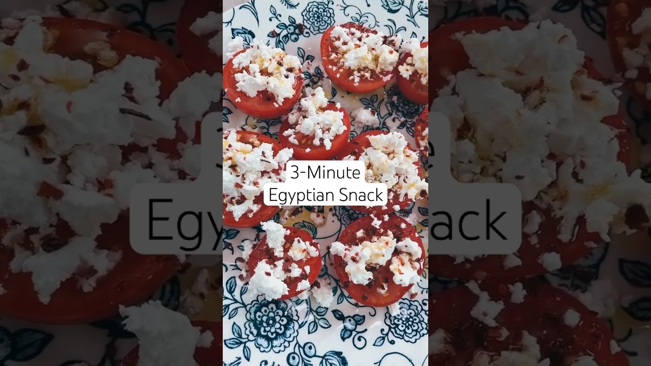 here is a childhood favorite snack that only takes me 3 minutes to make now every Egyptian friend of mine will recognize this snack we loved our Tomatoes All Summer Long particularly if you lived on the shores of the Mediterranean in Egypt once you cut up your favorite Tomatoes add to them your favorite creamy dreamy feta and then a dash of hot pepper flakes I’m using a leppo pepper it’s not too spicy and then a drizzle of good extra vergin olive oil