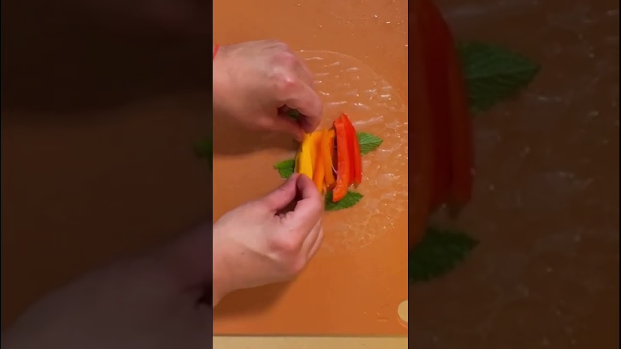 have you ever made a crunchy rainbow summer roll it’s so easy and so good let me show you how to make it so you start with rice paper you dip it into the water for about 15 seconds I add mint and then the rainbow is red and orange Peppers yellow Tangy mangoes green creamy avocado and crunchy red cabbage that is literally it it’s crunchy fabulous and rainbow happy