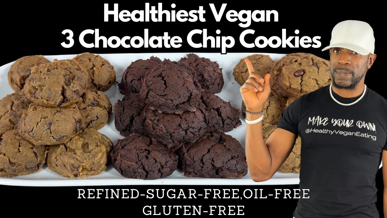 so these right here are some of the healthiest best tasting cookies I’ve ever had I’ve got my high protein peanut butter chocolate chip my double chocolate chip and my classic chocolate chip cookies all made healthy vegan Style no oil no wheat no refined sugar and no rice they don’t even contain flour and today I’m going to show you how to make your [Music] own all right so today we’re going to be making three kinds of delicious healthy cookies we’re going to make our classic chocolate chip a double chocolate chip as well as a high protein peanut butter chocolate chip cookie let’s talk about these healthy ingredients we’re going to be using uh our base is going to be made with chickpeas we’re going to have some H cashew butter we’re going to have some dates some baking soda some vanilla and some date sweetened chocolate chips and these are the ingredients now these ingredients are so much uh more healthy uh than a traditional cookie that has a refined wheat and the refined sugar and all those kind of things but this is going to make delicious cookies believe it or not I’m about to show you let’s get started all right so the first thing that I’m going to do is get all my ingredients minus my chocolate chips into my food processor I’m just going to set these aside and fold them in later but right now everything else goes in the processor so I like to start with blending the chickpeas dates and nut butter along with the vanilla and water nice and smooth before adding the baking soda and giving it another quick mix now that way the baking soda won’t be overly processed all right so now I’ve done um all my blending and I have the uh batter to the consistency that I want it here um so now at this point you could do one of two things you could remove this from the processor and put it in a bowl and then fold in your chocolate chips and go from there I just put it right into the food processor I just leave it here and just dump my chocolate chips and remember you can always adjust the amount of chocolate chips that you use to suit your own taste all right so the next thing I’m going to do is get my cookie dough onto the baking sheet and into the oven now I like to use a scoop to do this um it just keeps things uniform and a little less messy you could use a spoon though uh the scoop that I’m using has a capacity of 3 tablespoon so uh that’s what I’m using if you want to use the same scoop as me for the same measurement 3 tablespoons is what I’m using for this scoop now I prefer to make the cookies in a dome shape but you can flatten them if you prefer because they won’t spread while they’re baking okay so I’ve got them on the pan we’re going to put them in the oven and give them a quick bake while they’re baking we’re going to put together our chocolate chip peanut butter high protein cookies okay so for our second cookie we’re going to make some high protein peanut butter chocolate chip cookies absolutely delicious this might be my favorite of the three um okay so now our ingredients are going to mostly be the same but there are a couple of um differences here one we’re going to use um navy beans this time instead of the chickpeas now both are super healthy but navy beans are super high in lutein and in protein and iron so I love navy beans and The Taste is about the same as chickpeas as far as them being a mild tasting Bean so they work perfectly for this uh we’re going to use some dates again some baking soda vanilla um we’re going to use our dates sweet and chocolate chips now the things we’re going to change we use cashew butter for our first cookies now we’re going to use peanut butter for the peanut butter chocol chip obviously we’re going to add some protein powder of course this is my compliment protein powder you’ve seen this before this is the protein powder that I take um daily uh to get more protein because I am super active and I am over 40 and I do work out so those things um tend to make me feel like protein supplementation is a good thing for me so I supplement and of course it’s with this because it’s the cleanest protein powder out there I always say that the cleanest with the best um uh with the best amino acid profile I mean you just can’t beat the compliment brand there will be a description uh in the um uh there’ll be a link in the descriptions below so if you want to check out this protein powder and and look at it for yourself uh research it if you’re thinking about a protein powder this is the best one if you’re already taken it then you already know all right so these are the things we’re going to use to make these high protein uh peanut butter chocolate chip cookies let’s put them together already went over the ingredients we’re going to use uh keep in mind with the protein powder as I said there’s a link in the description below but I forgot to mention if you decide to make a purchase for the protein powder the supplements or any products that compliment has um you can also get a discount if you use code healthy vegan use code healthy vegan and get a discount all right so we’re going to start with our navy beans okay so just like the first cookies I’m starting by adding the beans dates Nut Butter vanilla and some water and then blending that until the mixture is nice and smooth then I’m going to add my protein powder now it’s important that you make sure that the protein powder you use is unflavored and unsweeten okay so now we’ve got our batter mixed just going to fold in my chocolate chips again okay and in go the chocolate chips and I’m going to use the same scoop that I used for the earlier cookies as [Music] well okay now I’m going to get the second batch of cookies in the oven also all right and now for our third cookie we’re going to make a double chocolate chip cookie so we’re going to have a base as chocolate as well as chocolate chips so our ingredien