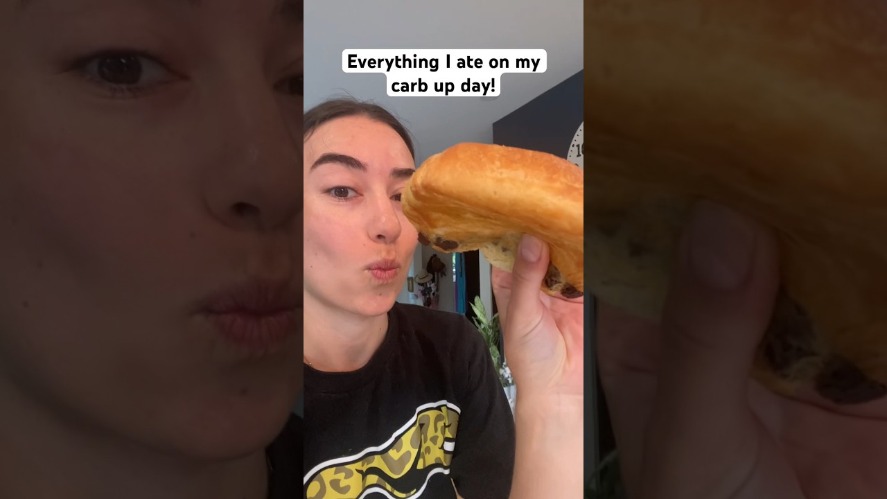 everything I ate on my carb up day I had eggs for breakfast like every other day with Sauer CRA avocado and olives and then I had a chocolate croissant and then for lunch I had this super cheesy shrimp lasagna with cherry tomatoes and for dessert I had this peanut butter fudge honeycomb ice cream and also for dessert I had a lemon bar with some homemade blueberry jam and then for dinner I had a grilled cheese sandwich with some yogurt and berries and then for extra dessert I had ice cream peanut butter and chocolate chips