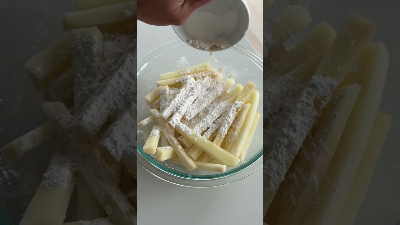 when you’re trying to lose weight small substitutions go a long way these high protein fish and chips taste and sound good we’re going to start out by peeling and cutting some rusted potatoes we’re going to put them in ice bath for about 30 minutes and then we’re going to dry off some cod and then salt it set that aside and we’ll beat an egg and then prepare our dry mixture it’ll Simply Be salt garlic powder paprika and some flour now we drain and dry off our potatoes from earlier and then we’ll add some olive oil the spices of your choice and corn starch make sure every fry is coated and in the air fryer they go while that’s air frying we’re going to coat our Cod first it’ll go in the flour and then in the egg and in the final step we’ll coat it in some panko breadcrumbs take the fries out of the air fryer and now it’s time to air fry the fish delicious airfried fish and chips at home enjoy