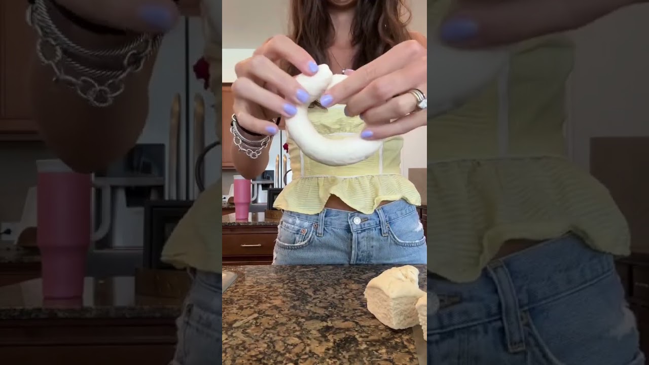 Combine your greek yogurt, flour, baking powder and salt.mix until completely combined. Split into 4 equal parts and roll out into balls. Poke a hole in the center and place on a lined baking tray.