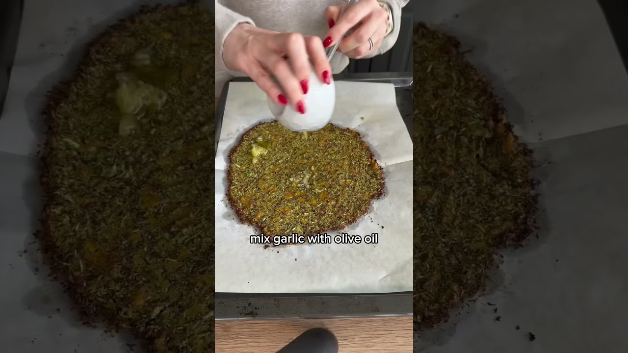 Blend broccoli in a food processor. In a large bowl, mix the flax seeds mixture, broccoli, 1/4 cup cheddar cheese, a pinch of salt, and some seasoning of choice. Spread onto a baking tray. Bake for 30 minutes at 350°F/ 175°C in the oven. Mix garlic with olive oil and spread onto the base. Sprinkle another tablespoon cheddar cheese and some parmesan. Bake for another 5-10 minutes in the oven or until golden brown.