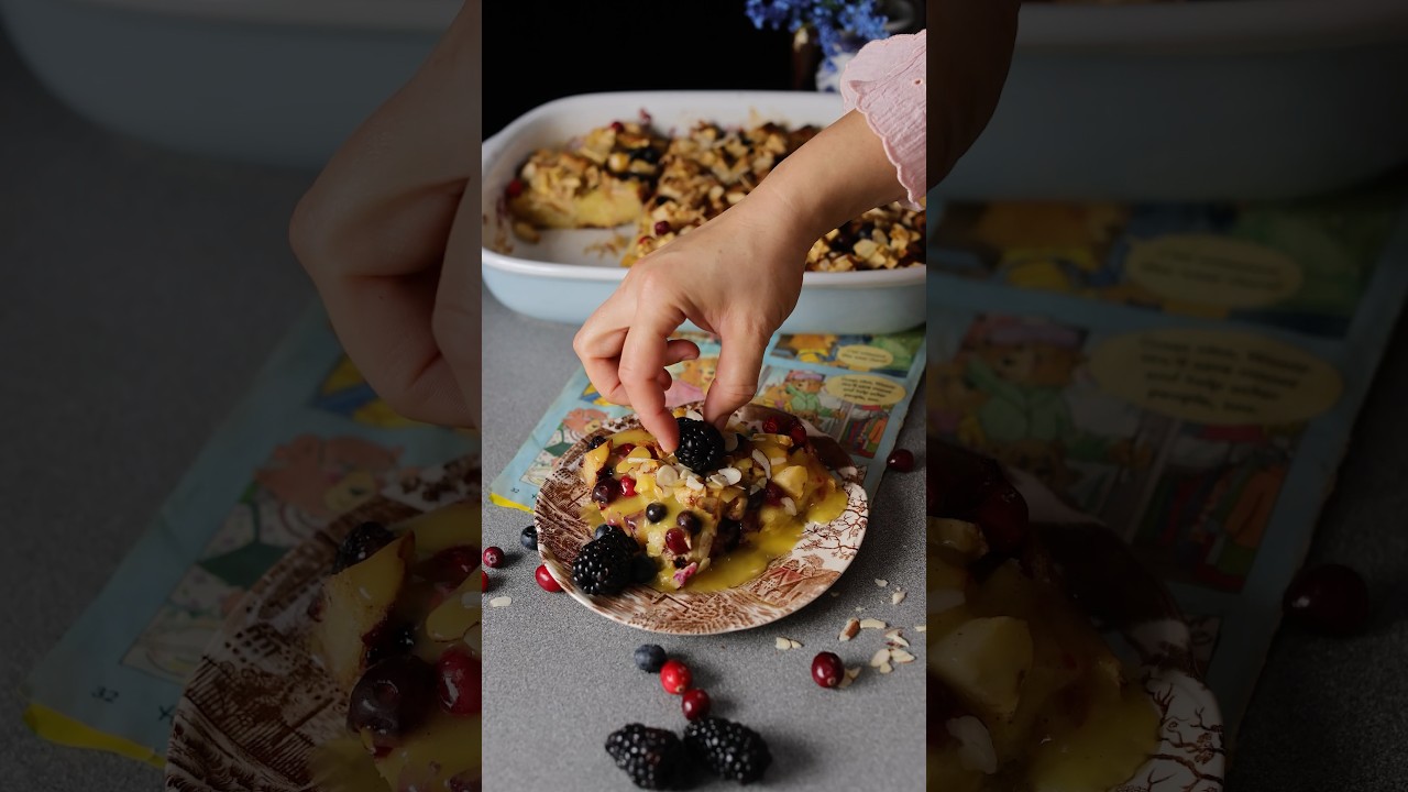 Dice the bread into cubes. Transfer the cubes to a 9/13-inch greased baking dish. Sprinkle the fresh berries and diced apples over it.