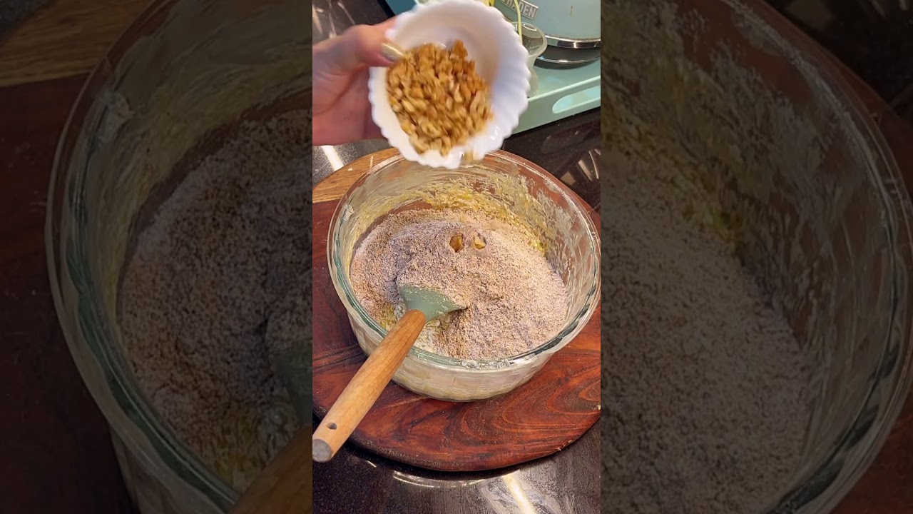 Now in this mix mashed bananas, all dry ingredients and walnuts. Fold them all together till everything is mixed together. DO NOT OVER MIX.