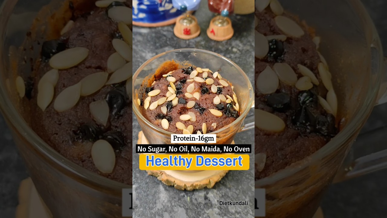 No sugar, no oil, no maida, no egg, no oven, healthy mug cake.This is a healthy dessert.Single mug cake gives nearly 16 gm proteins and 368 calories.