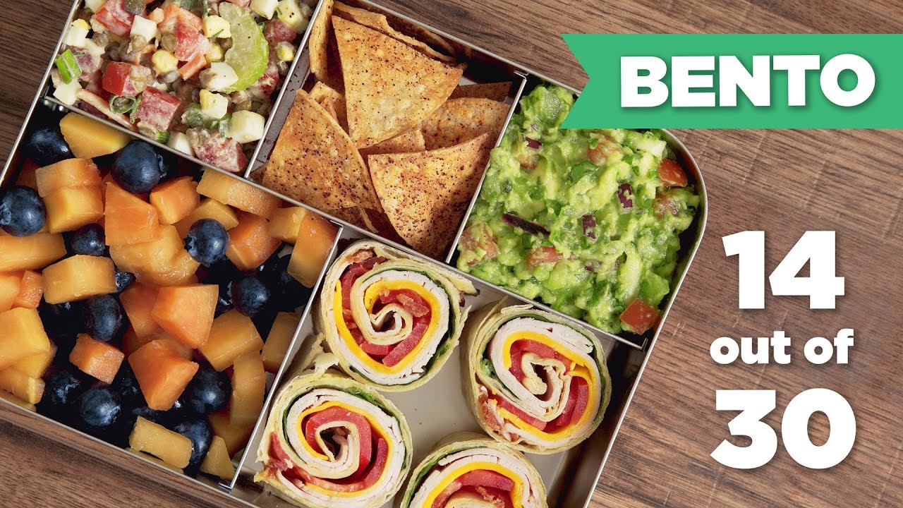 Bento Box #14! Make your own tortilla chips, vegetable guacamole, and turkey pinwheels for an easy, healthy lunch! Vegetarian lunch if you omit the turkey!