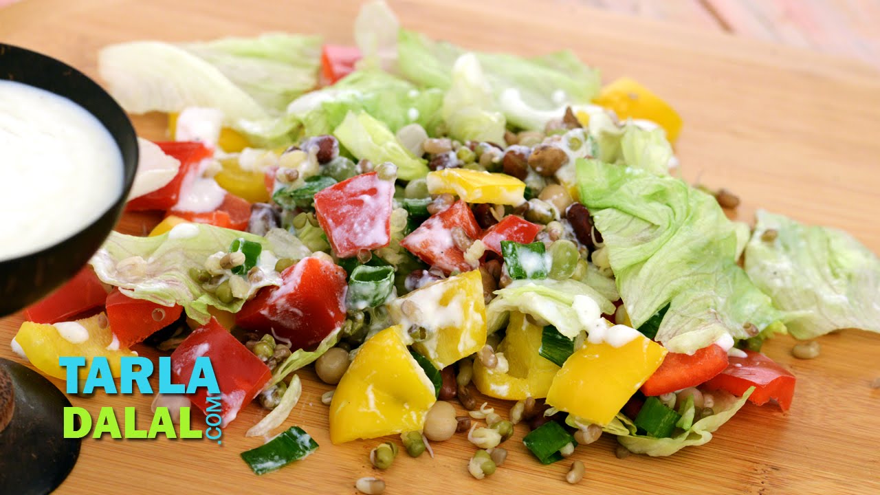 This simple, easy-to-make dressing calls for just low fat curds and lemon juice. Lettuce and sprouts add not only a nice crunch, but vitamin C as well to this salad. Sprouting increases the nutrient content manifold, thereby topping the list of nutritious foods.