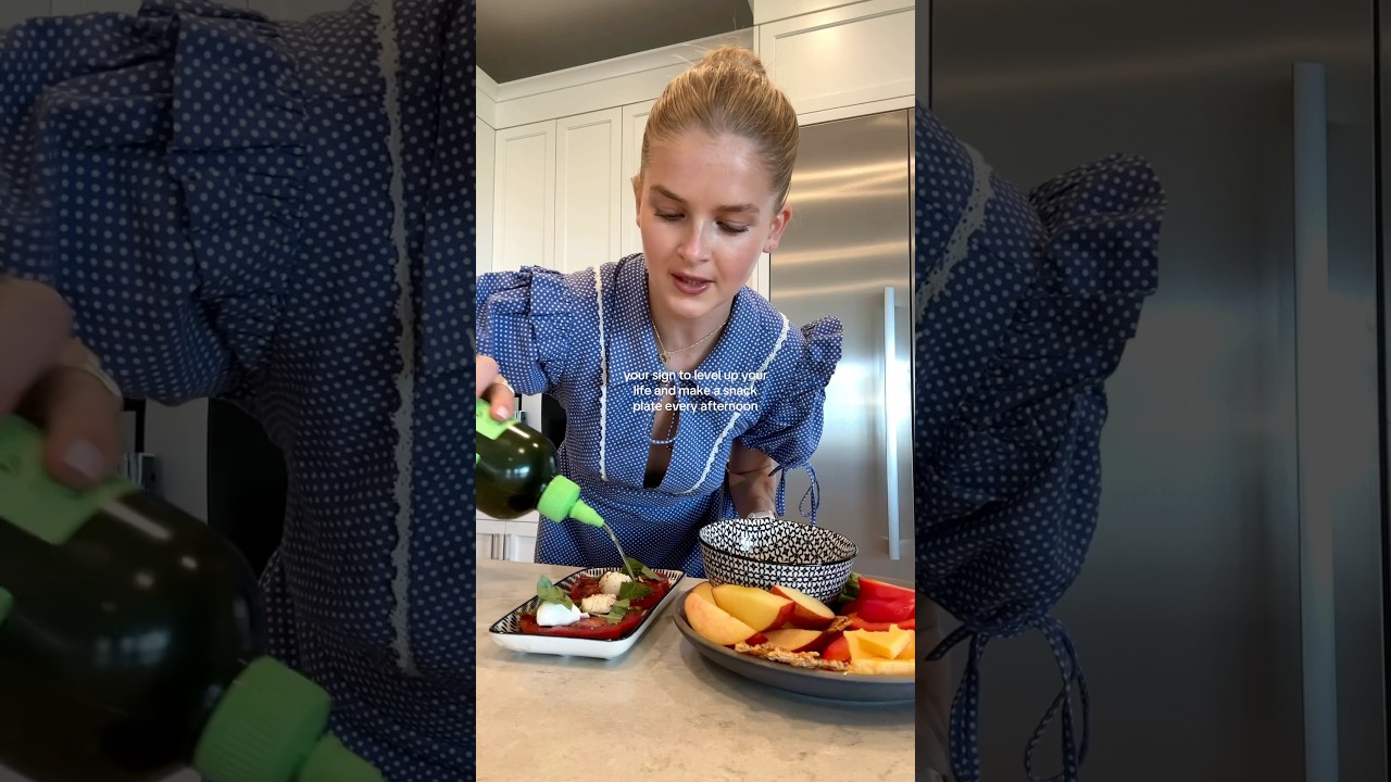 Let’s take my 3 p.m. snack plate, except it’s 3:54. We’re a little behind schedule today. You guys know the drill. All of my snack plates start off with one serving of dry and unsalted peanuts. For veggies, we’re doing some raw asparagus, some red bell peppers. Dip of the day is the Ithaca lemon dill hummus. This one is so good. For a little extra protein, we’re doing one of the medium tamok cheddar sticks. For crunch, we’re doing one of these everything parmesan crisps. I buy these at Whole Foods and they are so good. And for fruit, we’re doing half of a yellow peach. A little bonus snack. I made a mini capray. I’m going to top it with a little Graza olive oil. Wash it all down.
