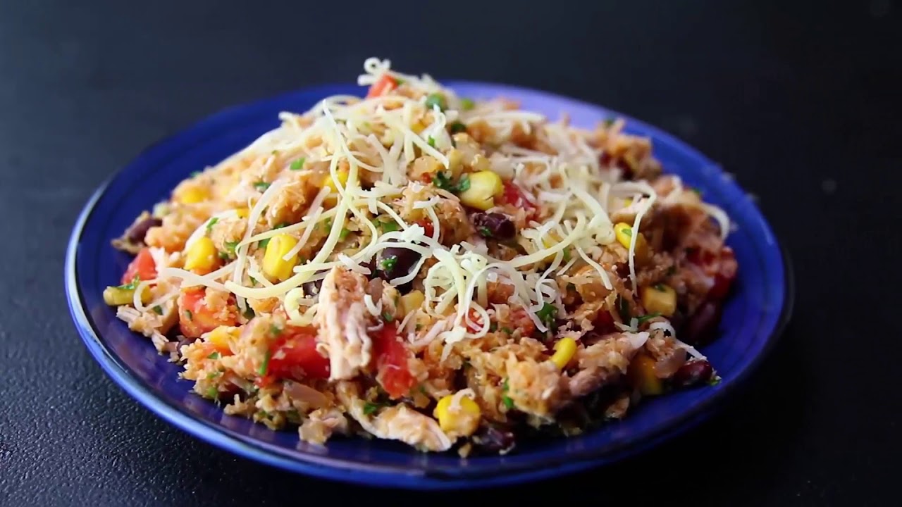 In a large skillet over medium heat, add oil. Add onion and cook until soft, 4 minutes. Add garlic, oregano, and cumin and cook until fragrant, 1 minute, then add drained grated cauliflower and season with salt and pepper. Cook, stirring occasionally, until tender, 3 to 5 minutes, then add tomato paste and stir to combine. Stir in chicken, black beans, corn, tomatoes, jalapeños, and parsley. Top with cheeses and serve.