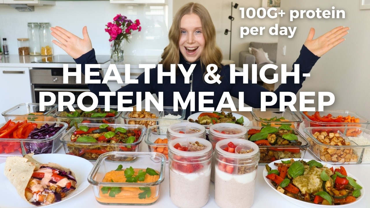 Healthy & High-protein Meal Prep😍 In this video we are going to prep easy, healthy & high-protein meals that are also weight loss friendly! We are prepping breakfast, lunch, snack and dinner that will get you 100G+ protein per day! We are making blended strawberry cheesecake overnight oats, spicy crunchy wraps, roasted red pepper hummus and sheet pan dinner!😋 Learn how to meal prep with these easy recipes!