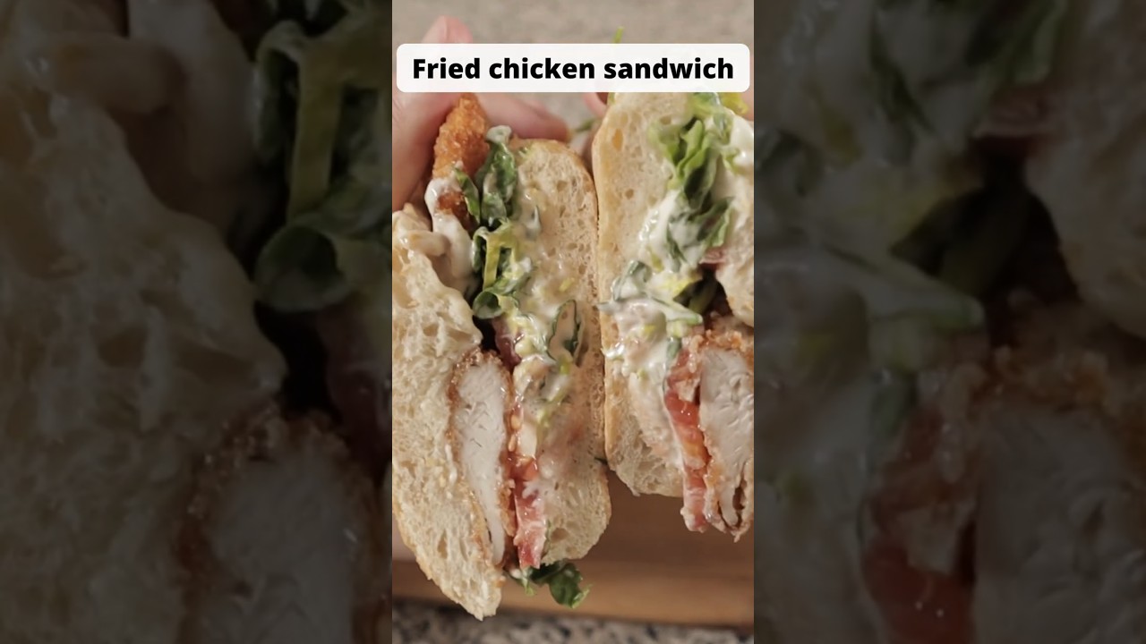 This is how you make a fried chicken sandwich. I will show you how to enjoy a fresh and flavorful baguette, crisp lettuce, refreshing and fragrant tomatoes, and topped with chicken. Let’s make a chicken sando!