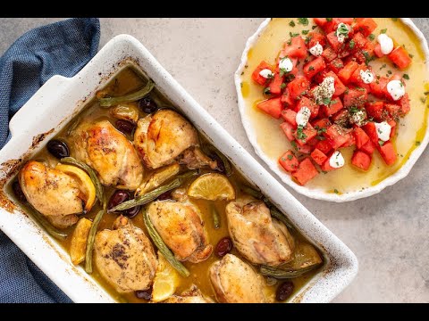 Tender, juicy chicken in a honey, herbed syrup finished with fresh kalamata olives. Serve with a fresh watermelon, mint and oregano salad, finished with yoghurt a honey syrup.