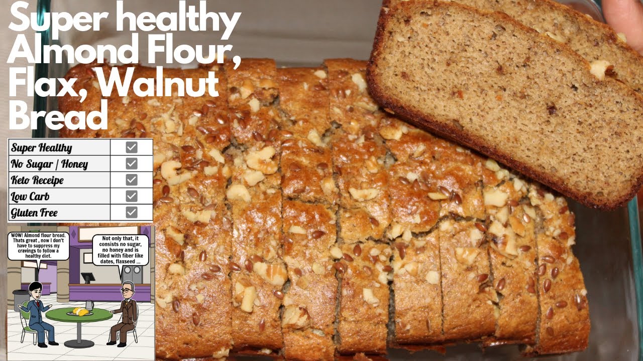 This video is about Almond flour bread which is made by cinnamon powder, flax seeds, beautifully texture garnished with walnut.