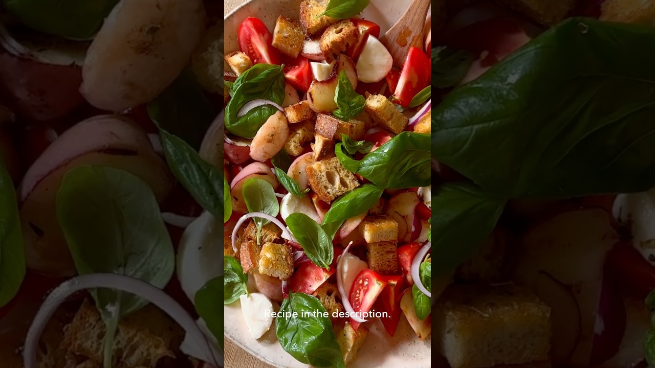 Panzanella is a classic Tuscan saladmade of dried Italian bread, ripe tomatoes and a simple vinaigrette. This version adds grilled peaches which brings caramelized flavor to this dish without added sugar.