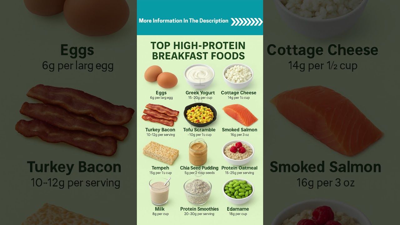 Breakfast is a great time to load up on protein since it keeps you fuller and energized throughout the day. Here are some of the top high-protein breakfast foods (with approximate protein values per serving):