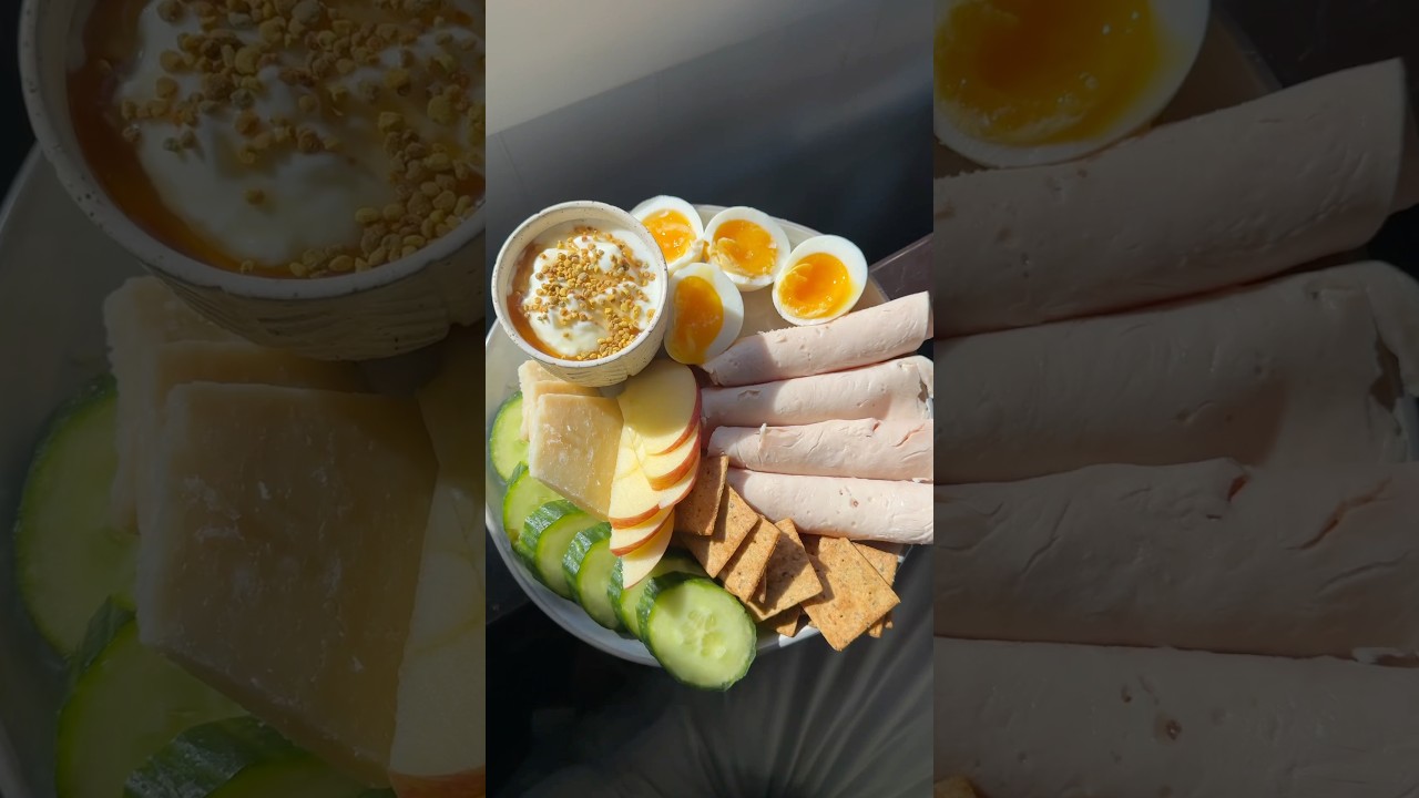 Healthy snack plate incoming…Details – Turkey slices – Soft boiled eggs – Almond flour crackers – Cucumber slices – Apple slices – Greek yogurt + honey + bee pollen – Parmesan#healthyrecipes #easyrecipes #foodasmr #wellnesstips #snackplate CuisinehealthyHealthy CuisineHealthy Ideashealthy recipeshealthy snacksHealthy Snacks IdeasHealthy Snacks RecipesideasPlaterecipeSnacksnacksSnacks IdeasVideoVlogYouTube