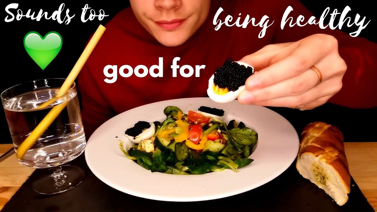 In this ASMR food unboxing (먹방), I eat salad, eggs with caviar and bread and drink water.