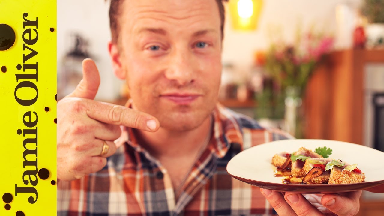 Hi Food Tubers! Jamie’s got a delicious seared tuna recipe to show you – full of flavour and really quick and easy to make. With a crispy sesame seed coating and a divine ginger and soy sauce dressing this dish really hits the gastronomic spot. Served with garlic chips and a sprinkling of fresh chilli and coriander you’ll feel like you’re dining out while kicking back at home.