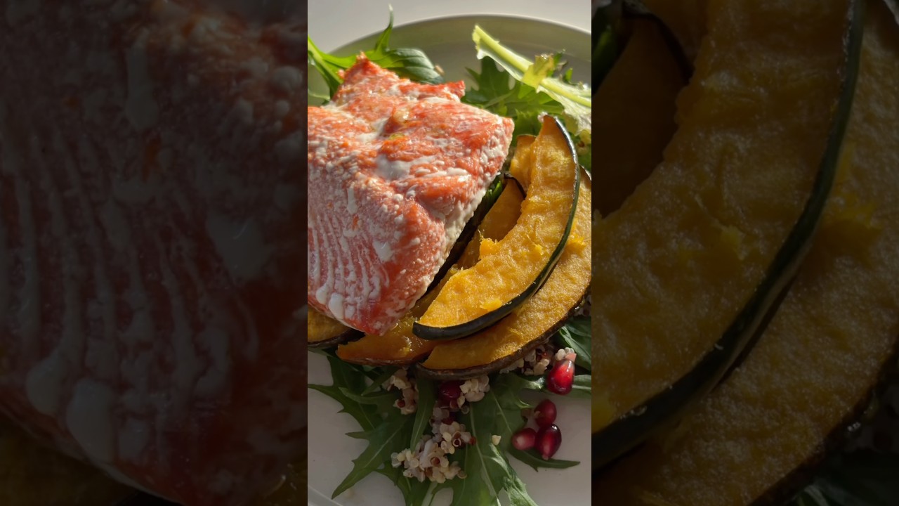 Broiled salmon, roasted acorn squash, fluffy quinoa, mixed greens, bright pomegranate, and a sweet maple Dijon dressing – it’s balanced, delicious, and perfect for weeknights or meal prep.
