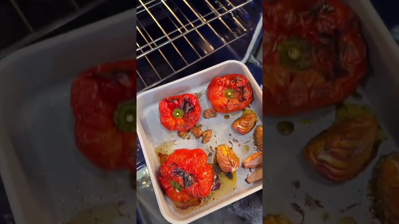 1.Grab an oven safe dish. Add 3 red bell peppers, half a small onion, 1/2 shallot, and 3 garlic cloves. Drizzle with olive oil, season with salt, pepper, and 1 tsp sweet paprika, 1/2 tsp oregano or thyme.