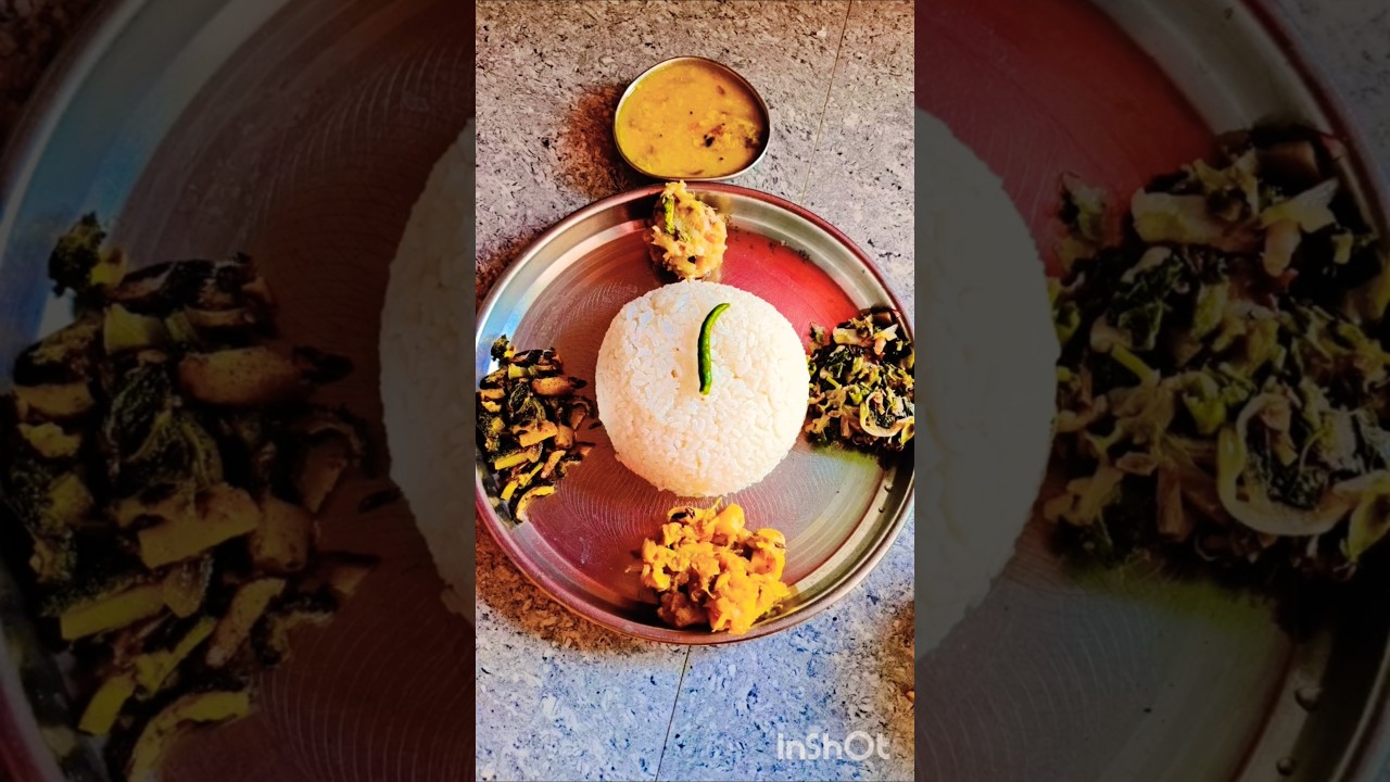 Traditional lunch, Indian veg meal, rice and dal, bhaat dali, vegetable bhaja, santula curry, saag dish, home-style food, healthy vegetarian lunch, balanced meal, simple Indian food, comfort food, seasonal vegetables, leafy greens, Indian thali, nutritious lunch, everyday meal