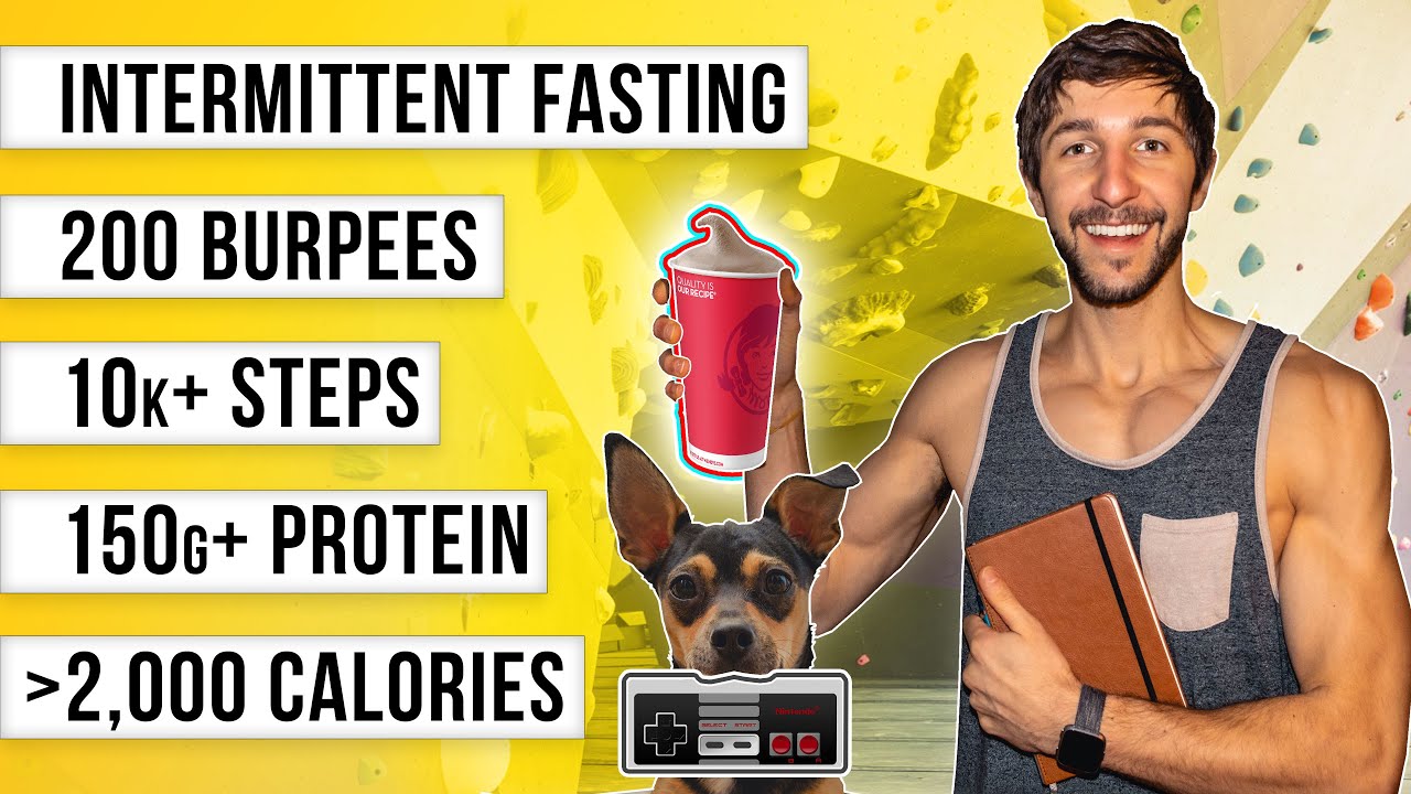 Intermittent Fasting • ~2,000 Calories • 150+g Protein • 200 Burpees • 10k+ Steps • Cold Showers • Yoga • Meditation • Mindfulness • Journaling • Rock-Climbing • Coffee • DIY Frosty • Quest Cookie • Nutrition Facts Explained • Retro Gaming • Cute Doggo • ALL OF THIS AND MORE, in my first VLOG.