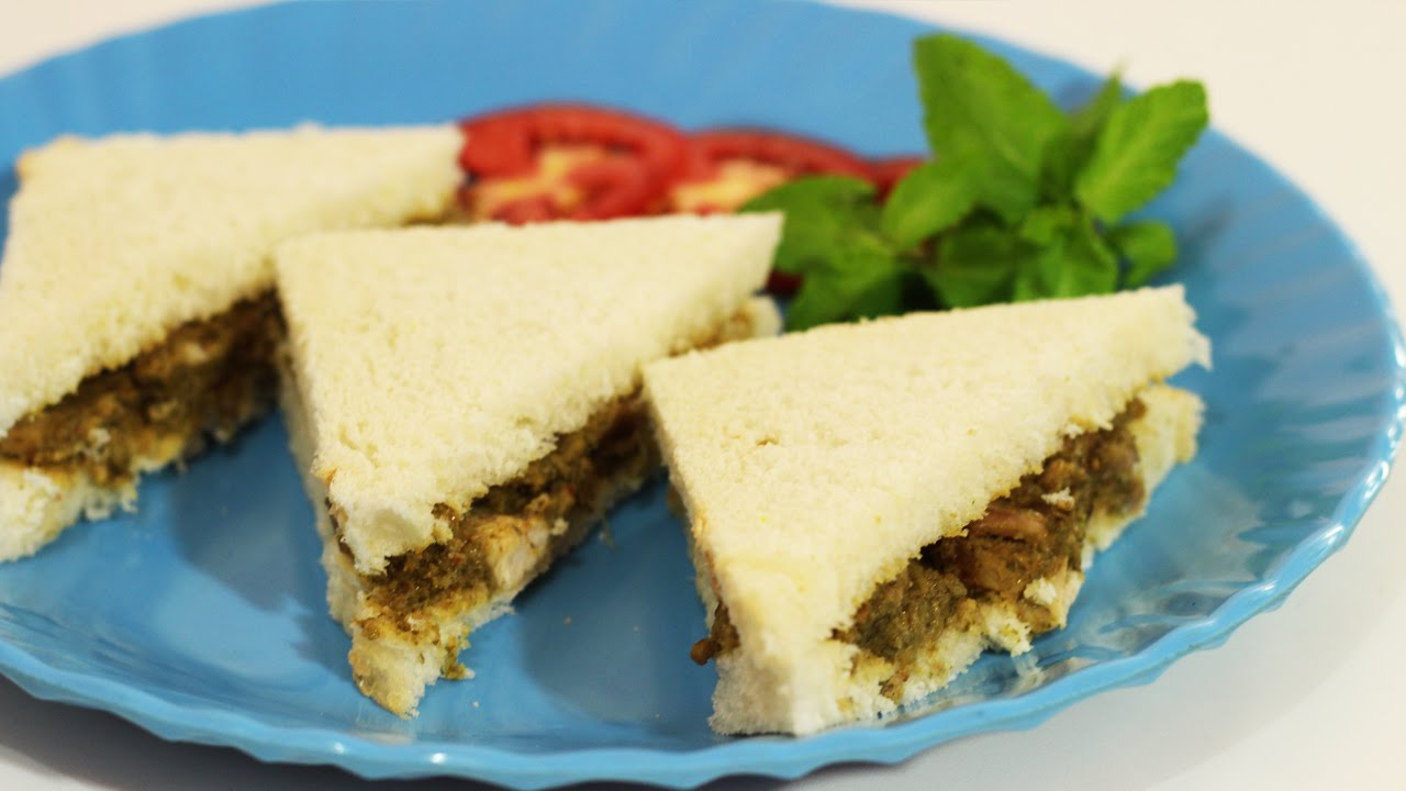 After cool the chicken now put the minty chicken into your bread and spread it evenly and put another piece of bread over the minty chicken.Now your mint yogurt chicken sandwich is done.Just cut the sandwich in triangle shape or one corner to another corner.