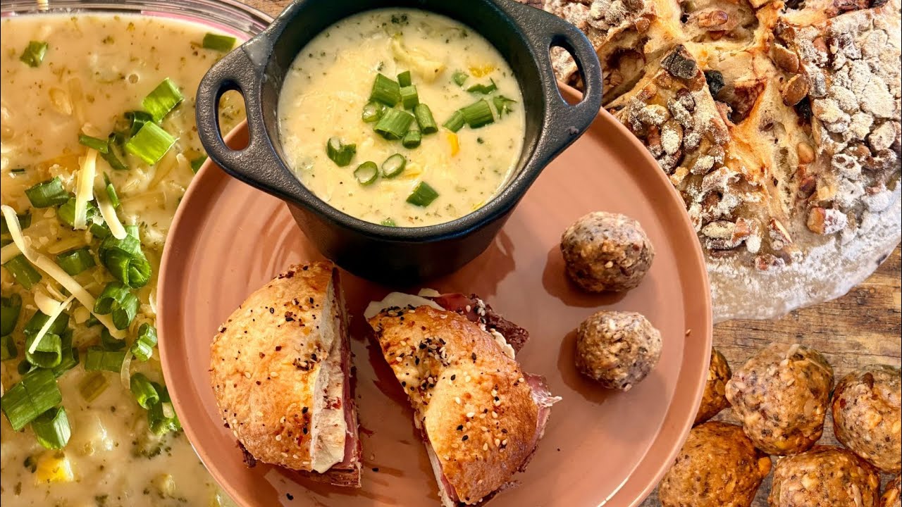 One of the best cozy, comforting meals featuring my creamy White Cheddar Broccoli Soup packed with fresh veggies like white and yellow carrots, onions, celery, and a savory chicken bouillon base. Paired perfectly with a mouthwatering Bagelwich on homemade sourdough Everything Bagels, layered with smoky mozzarella and tender pastrami. Baked up a loaf of my specialty sourdough bread, full of walnuts, pecans, pumpkin seeds, cherries, blueberries, and craisins. Plus, whip up my quick no-bake Elevensies Protein Balls – the ultimate energy-boosting snack using 11 powerhouse ingredients: almonds, peanuts, cashews, pistachios, walnuts, pecans, pumpkin seeds, sunflower seeds, chia seeds, hemp seeds, and flax seeds. Perfect for healthy eating, meal prep, or satisfying those mid-day cravings!