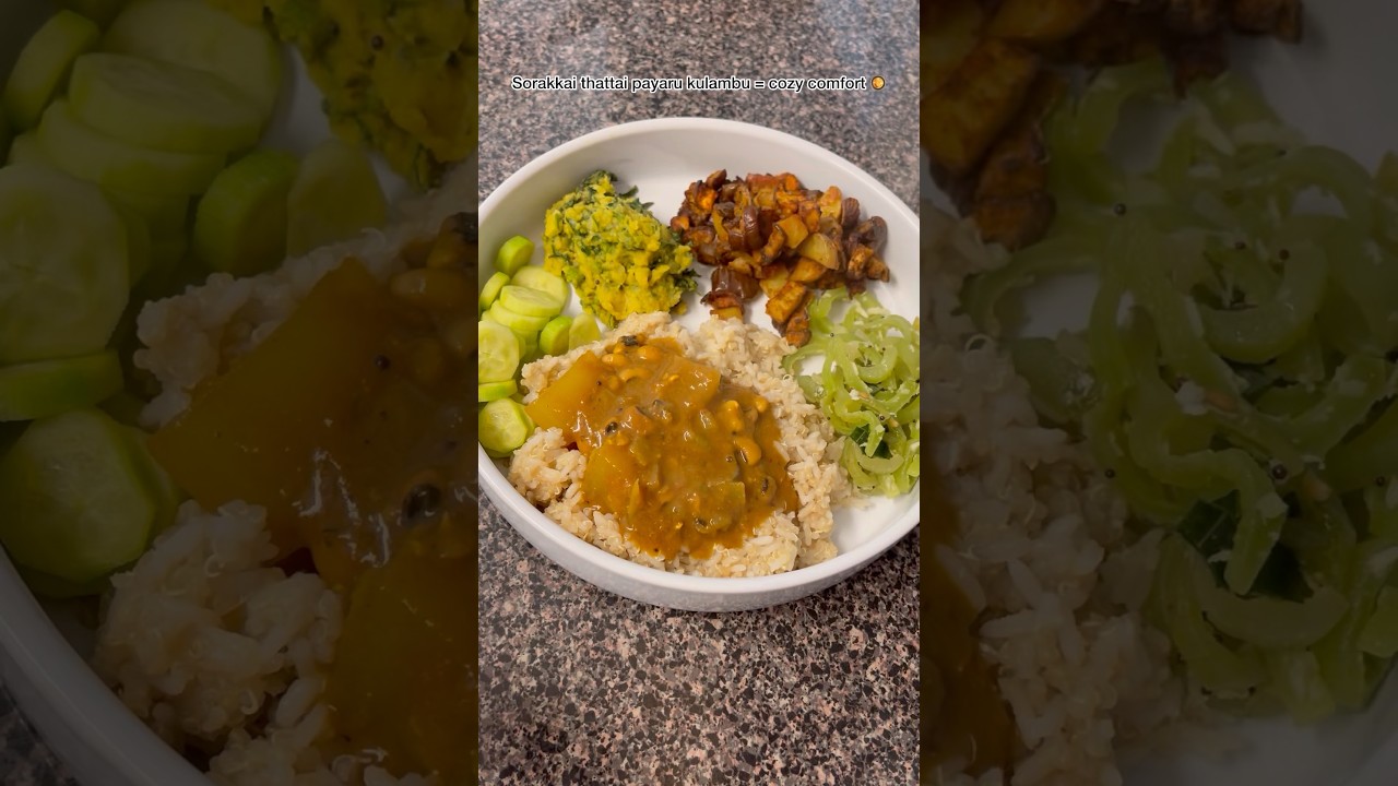 🍚 Quinoa + rice🥬 Keerai kootu🥒 Pudalangai poriyal🍆 Oven roasted kathirikkai urulai varuval🥘 Sorakkai thattai payaru kulambu🥒 Fresh cucumber crunch