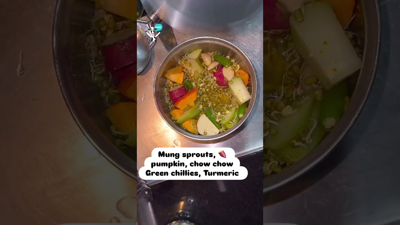 1. Pressure cook 1 cup mung sprouts, 1/2 sweet potato, 1/2 chow chow, yellow pumpkin, 3-4 green chillies, water, grated fresh turmeric for 3-4 whistles