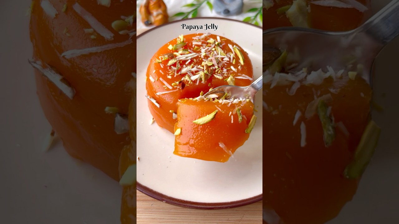 I blended fresh ripe papaya (without adding water), mixed it with agar agar, cooked it with sugar for 5 minutes, then set it in a glass mould. After refrigerating for 3–4 hours, the jelly is ready. Garnish with pista and almonds for that perfect festive touch.