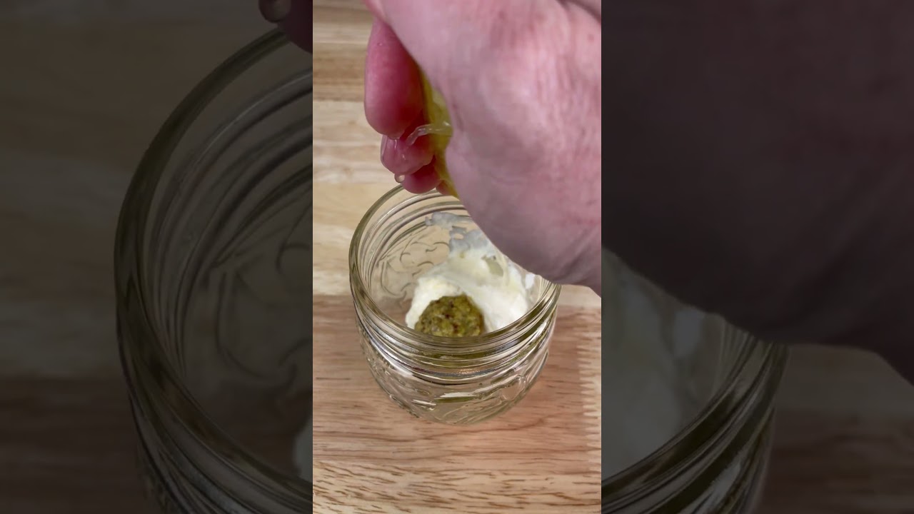 1 cup mayo or Greek yogurt, 2 teaspoons grainy mustard, 2 teaspoons lemon juice, 2 teaspoons olive oil, 1 teaspoon apple cider vinegar and pinch of salt. Add all the ingredients to a small mason jar, mix well and enjoy.