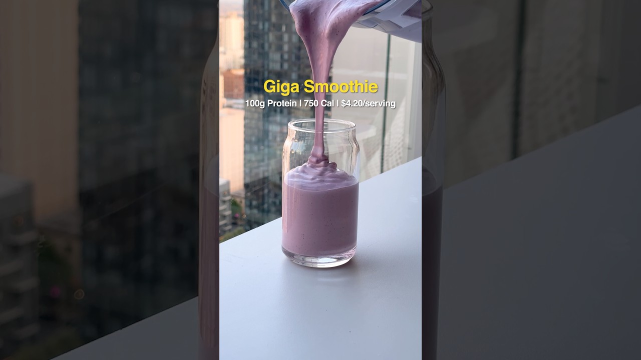 This is the Giga Smoothie! All it takes is 5 low-cost ingredients to pack 100g of protein into a delicious smoothie. This smoothie taste is good as any that I’ve made or bought, and it bangs out over half of my daily protein goal in the process. That’s a win! 🍓💪🏼