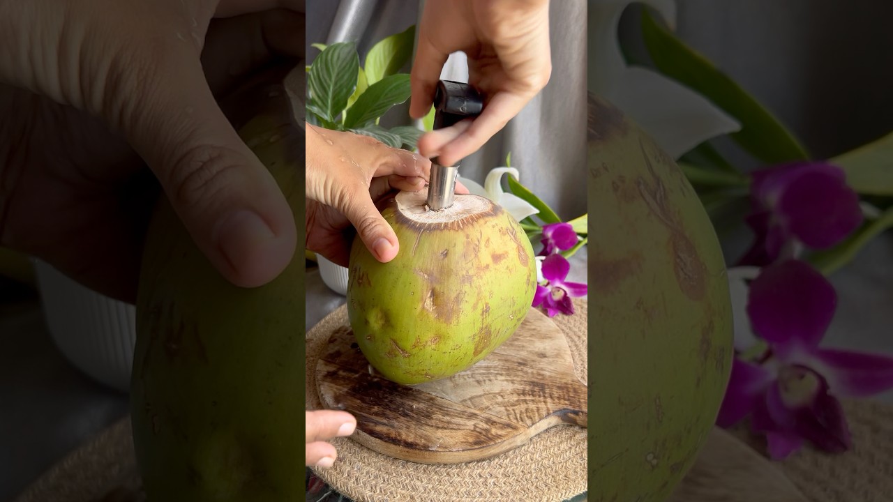 3️⃣ In a glass, pour fresh coconut water.
