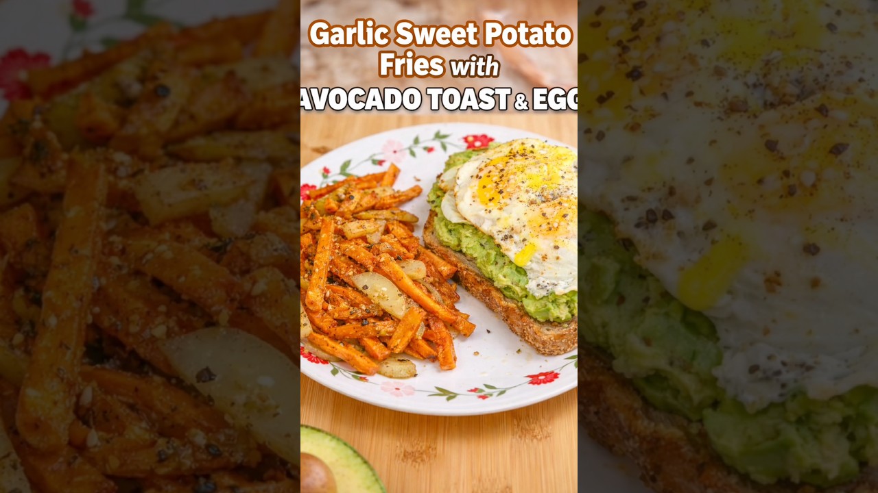 This recipe combines crispy garlic sweet potato fries with creamy avocado toast topped with perfectly cooked eggs.