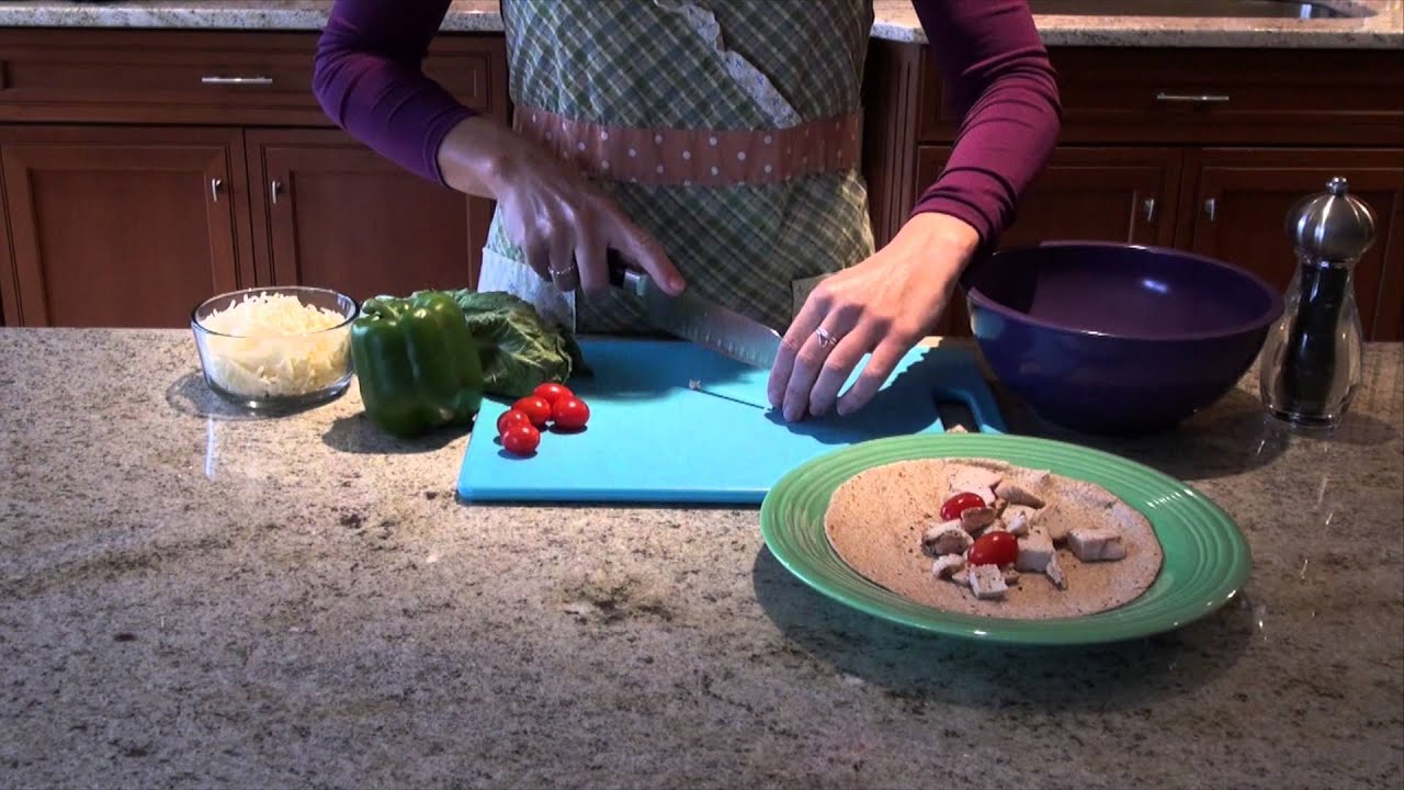 Ingredients and steps to prepare a chicken, veggie and cheese wrap.