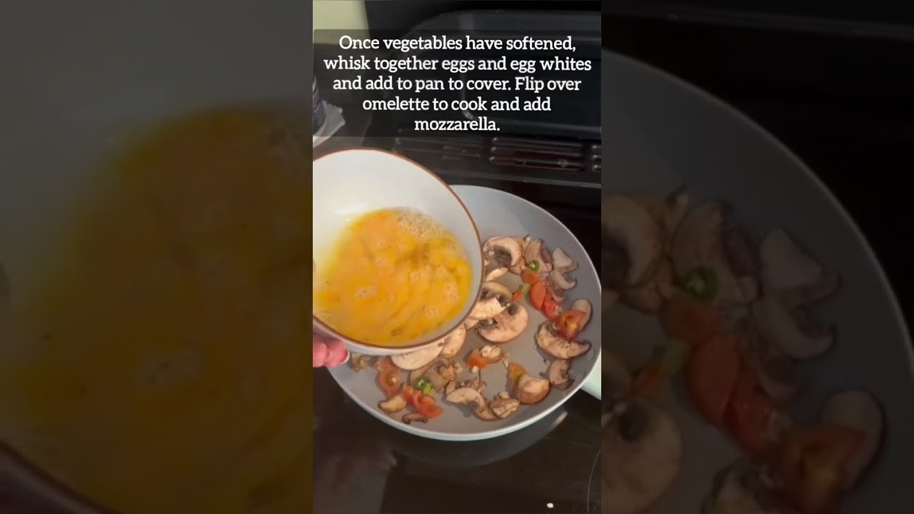 2. Once vegetables have softened, whisk together eggs and egg whites and add to pan to cover. Flip over omelette to cook and add mozzarella.